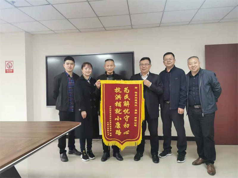 ,代表石马社区群众将写有“为民解忧守初心·抗洪铺就小康路”的锦旗赠送到交建集团党委书记、董事长漆家华手中,为在今年8月抗洪抢险救灾中交建集团对石马社区给予的支持和帮助表示感谢。