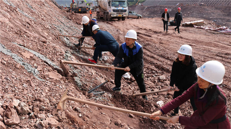 在活动现场,工程部部长刘太亮给大家介绍了雨名快速通道项目建设情况,高边坡支护班组相关负责人现场指导高边坡支护防护工作。全体党员、入党积极分子和公司其他员工在工程管理人员指导下,挥镐舞锄,积极参与劳动体验。