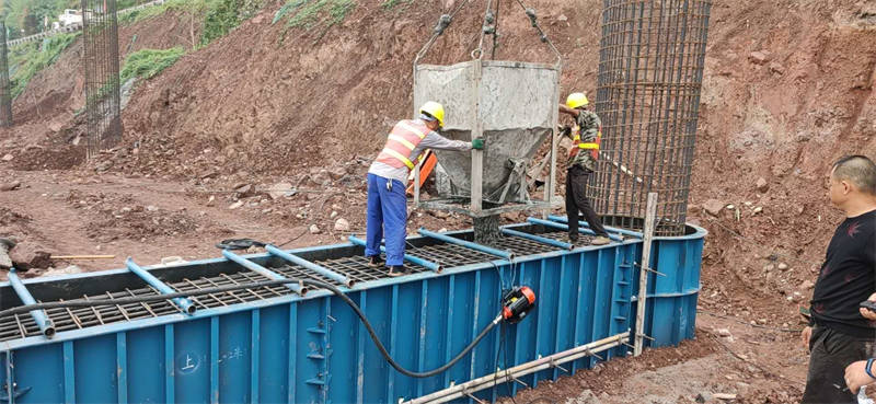 岩板田大桥(左幅)下部结构是该项目的控制性工程,为桩基础+地系梁+墩柱+盖梁结构,此次浇筑的首根地系梁是5#地系梁。由于地质情况复杂多变、河水深,且右线既有道路边坡山体陡峭,需要在雨季前完成下部结构桩基、地系梁、墩柱的施工,工期紧、任务重,组织协调难度大。