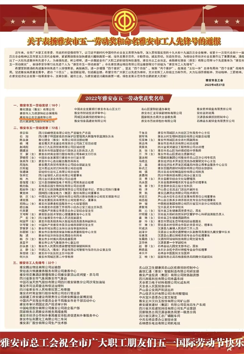 4月28日,市总工会召开2022年雅安市庆祝“五一”国际劳动节暨表扬大会,交建集团雅安市公共交通有限公司荣获全市五一劳动奖状殊荣。