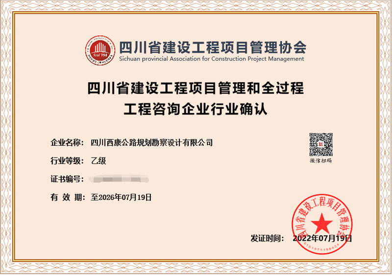 日前,经四川省建设工程项目管理协会评审,交建集团四川西康公路规划勘察设计有限公司获得“四川省建设工程项目管理和全过程工程咨询企业行业乙级资格”确认,成为四川省内为数不多获得开展全过程项目管理和咨询资质企业之一。