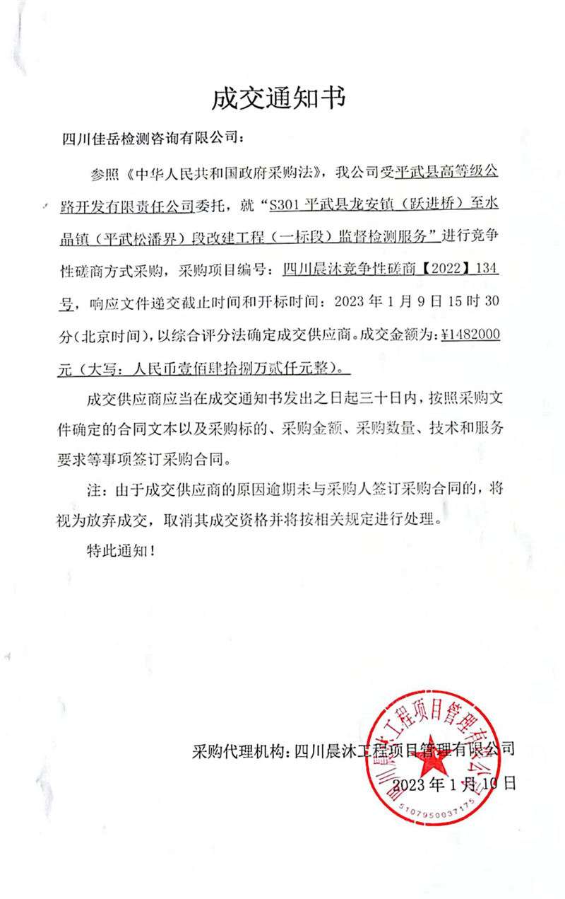 中标项目为S301平武县龙安镇(跃进桥)至水晶镇(平武松潘界)段改建工程(一标段)监督检测服务项目,成交金额148万余元。此次成功中标展示了公司的检测能力和市场竞争力,为公司“走出去”积极承揽市外、省外业务增添信心。