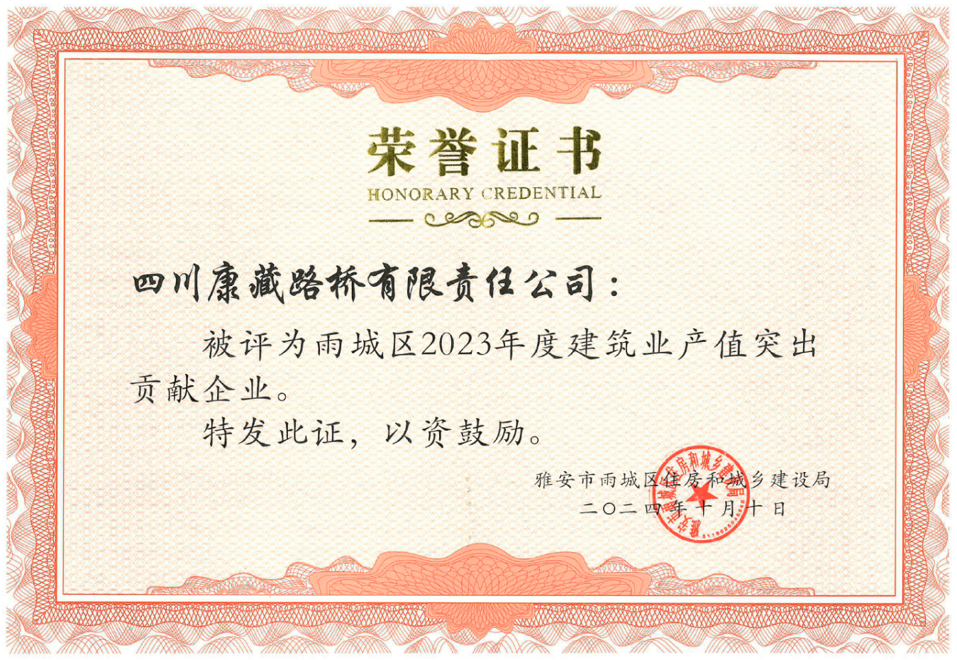 今年10月,路桥公司被雅安市雨城区住房和城乡建设局评为“雨城区2023年度建筑业产值突出贡献企业”。下一步,路桥公司将持续贯彻落实市委、市政府决策部署,把学习贯彻落实党的二十大精神与生产经营工作结合起来,发挥项目引领支撑作用,为地方经济的发展持续贡献力量。