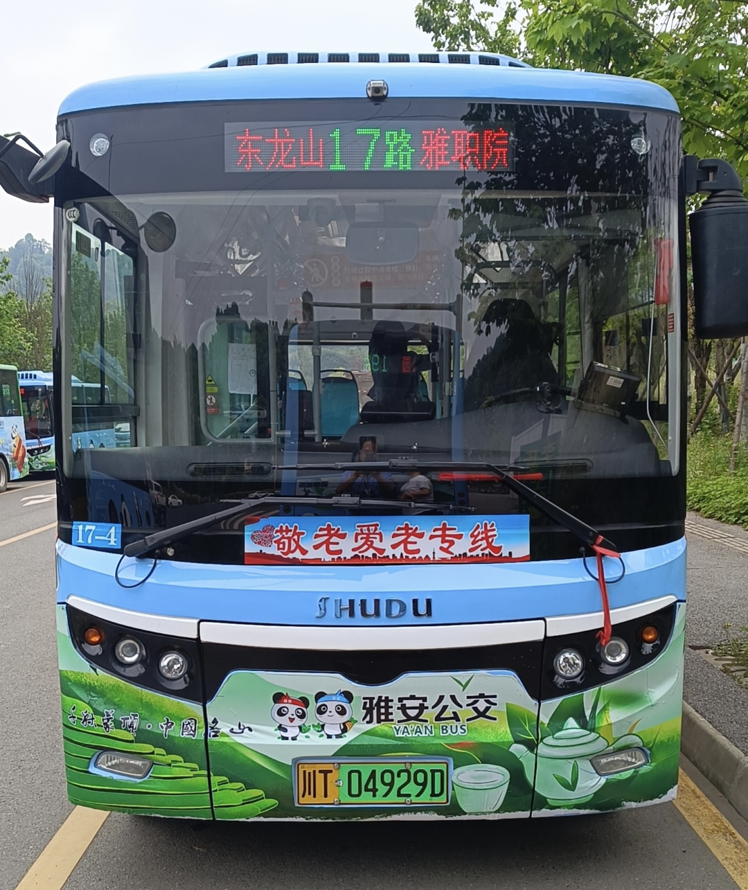 17路示范线为雅州快线,主要连接雨城区河南片区至名山区,沿线途经医院、公园、商场等老年人日常生活、就医、娱乐等场所,在车身上张贴敬老爱老线路标贴,在车厢内张贴公益广告、放置便民服务箱,营造了浓厚的敬老、爱老、助老的良好氛围。