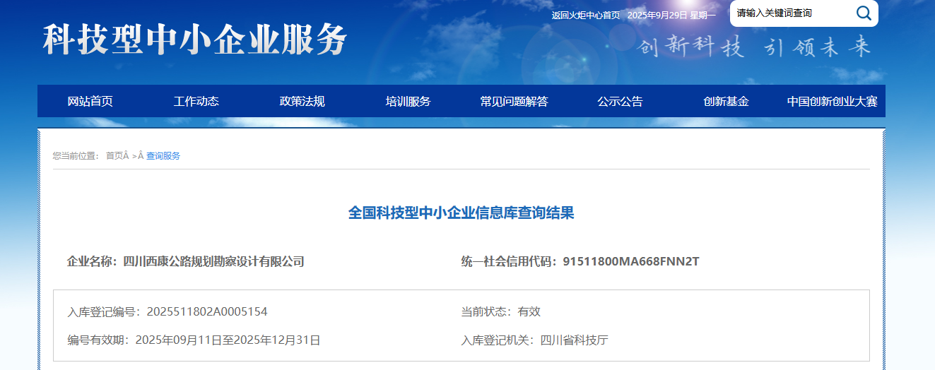 近日,四川省科学技术厅公布本年度第二批科技型中小企业名单,四川西康公路规划勘察设计有限公司再获“科技型中小企业”认定,这一荣誉体现了公司在科技创新发展道路上的持续进步与实力积淀。