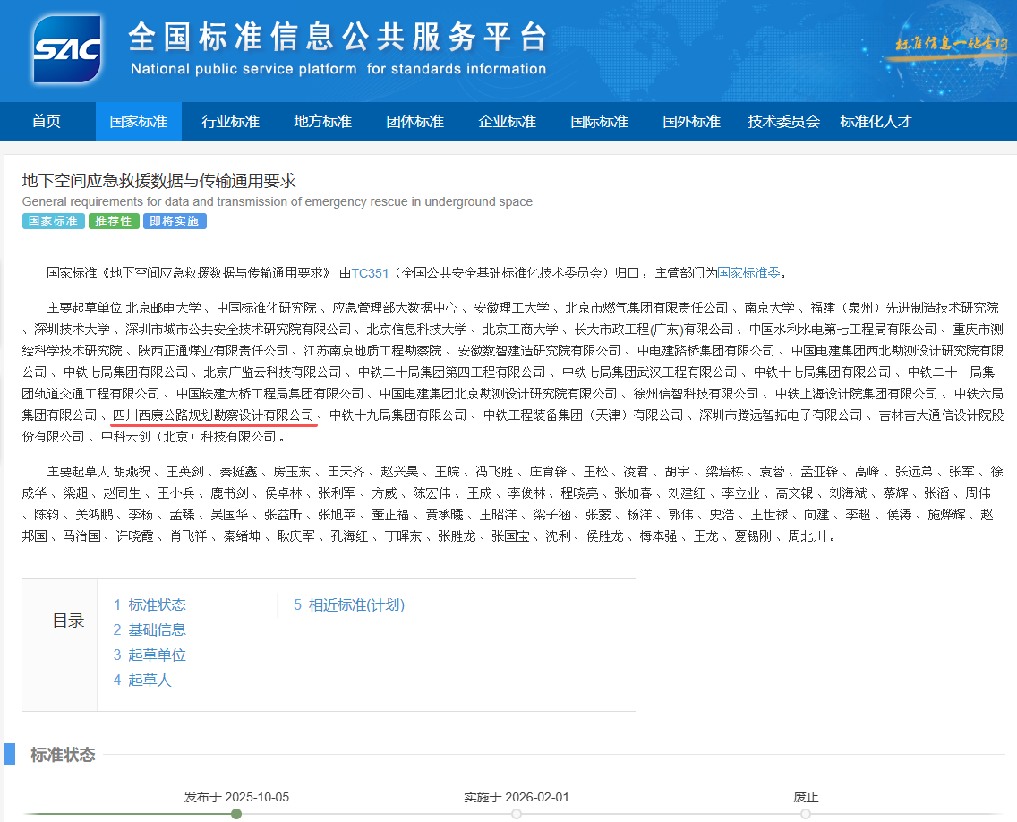 近日,由四川西康公路规划勘察设计有限公司参与编制的推荐性国家标准GB/T 46338-2025《地下空间应急救援数据与传输通用要求》经国家标准委批准正式发布,将于2026年2月1日起正式实施。