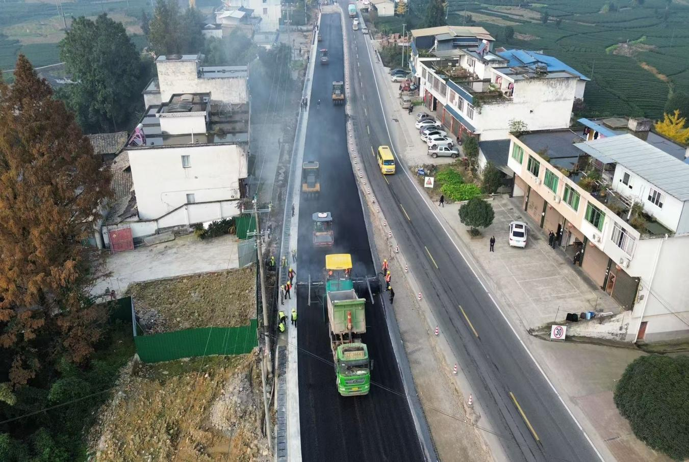 国道318线名山区黑竹(成都界)至雨城区多营段改建项目作为四川省重点项目,同时也是雅安“三区”同城化经济环线中北环线的重要组成部分,自开工以来始终保持高效推进态势。为实现2026年春节前主体工程贯通目标,近期,项目建设现场掀起“大干快上”热潮,全体参建单位以“时不我待”的紧迫感冲刺节点任务,各项工作取得突破性进展。截至目前,项目累计完成投资24.95亿元,完成产值17.6亿元;路基、桥涵、隧道工程均完成90%以上,陆续进入路面工程阶段,前12公里改建段已建成通车。