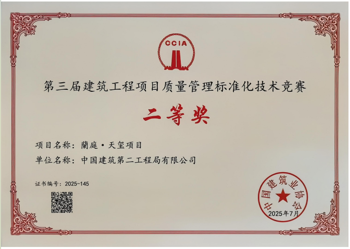 近日,交建开发公司旗下“蘭庭・天玺”项目在中国建筑业协会组织的“第三届建筑工程项目质量管理标准化技术竞赛”中荣获二等奖。此次获奖,标志着“蘭庭・天玺”项目的质量管理体系与工程实体质量获得了行业权威认可,为项目后续创建更高层次的品质奖项积累了宝贵经验。