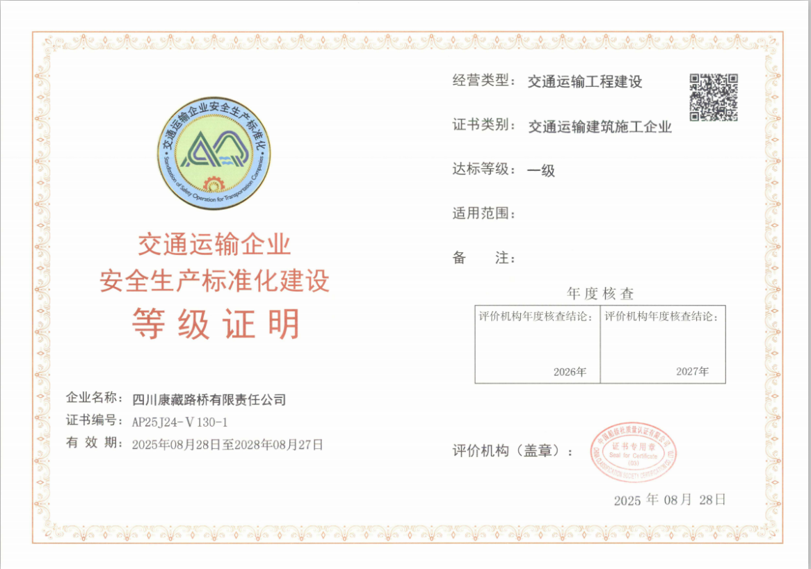 近日,经交通运输部交通运输企业安全生产标准化评价机构综合评定,康藏路桥公司获评安全标准化一级企业并取得证书,标志其安全生产管理体系获国家最高标准认可。