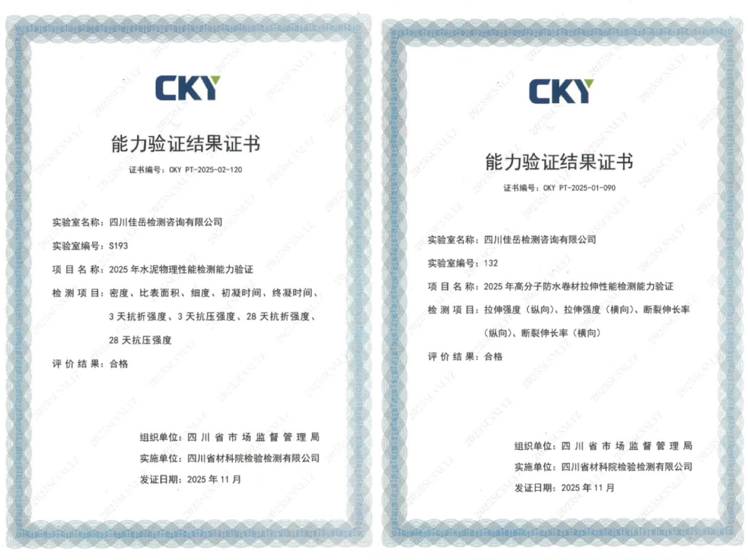 近日,佳岳公司顺利完成2025年度检测能力验证工作,“高分子防水卷材拉伸性能检测”与“水泥物理性能检测”两项项目结果均获“满意”评价。