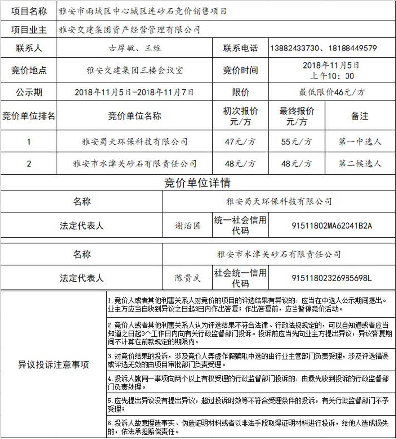 米兰体育-米兰(中国)官网 资产经营管理有限公司关于雅安市雨城区中心城区连砂石竞价销售结果公示
