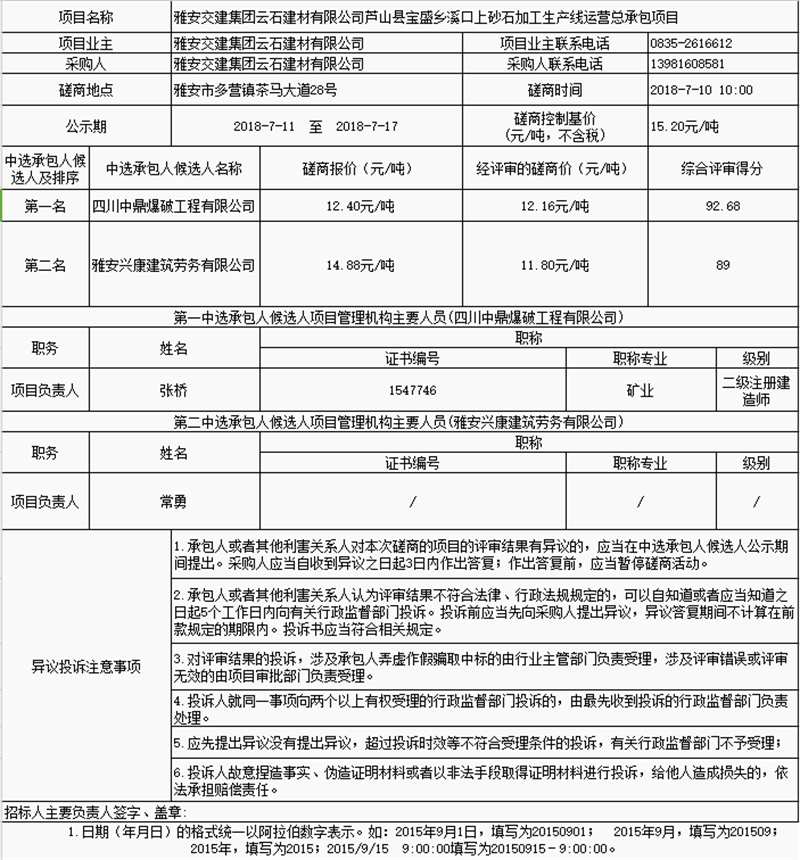 米兰体育-米兰(中国)官网 云石建材有限公司芦山县宝盛乡溪口上砂石加工生产线运营总承包项目中选承包人公示