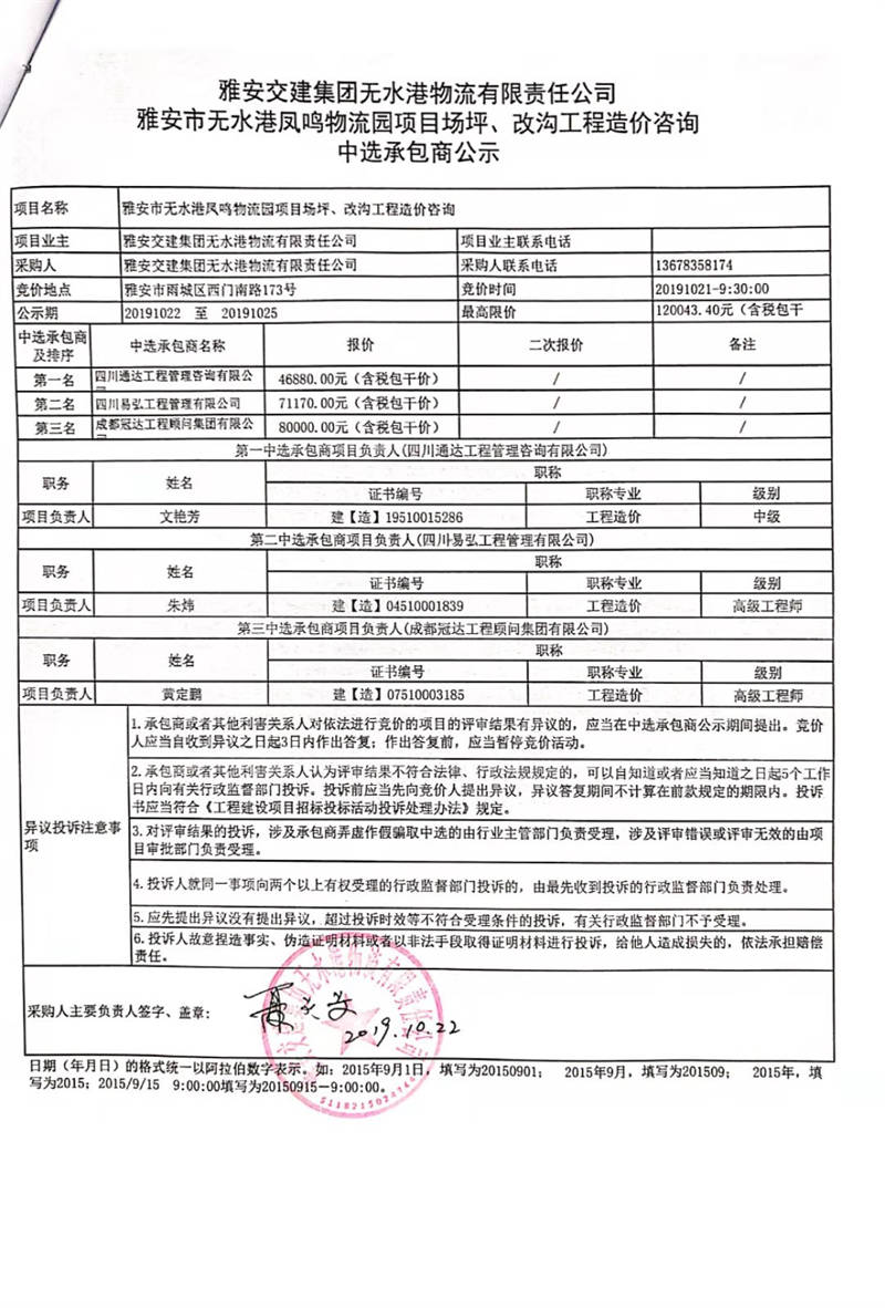 米兰体育-米兰(中国)官网 无水港物流有限责任公司雅安市无水港凤鸣物流园项目场坪、改沟工程造价咨询中选承包商公示
