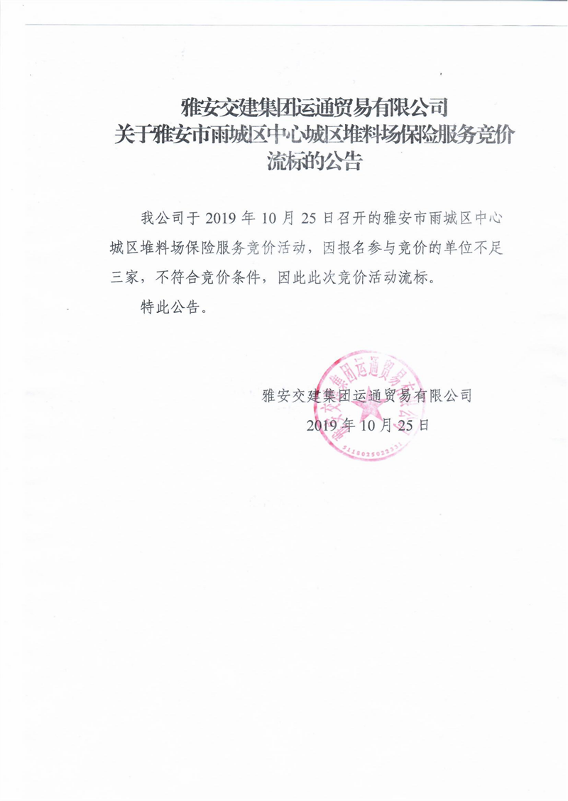 米兰体育-米兰(中国)官网 运通贸易有限公司关于雅安市雨城区中心城区堆料场保险服务竞价流标的公告