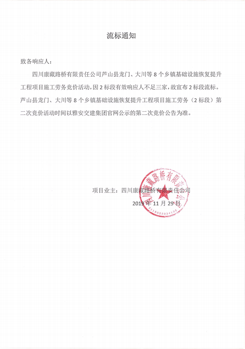 四川康藏路桥有限责任公司芦山县龙门、大川等8个乡镇基础设施恢复提升工程项目施工劳务(2标段)竞价流标通知