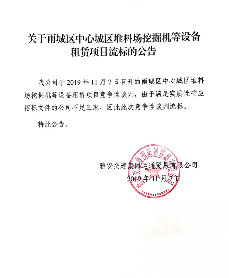 米兰体育-米兰(中国)官网 运通贸易有限公司关于雨城区中心城区堆料场挖掘机等设备租赁项目流标的公告