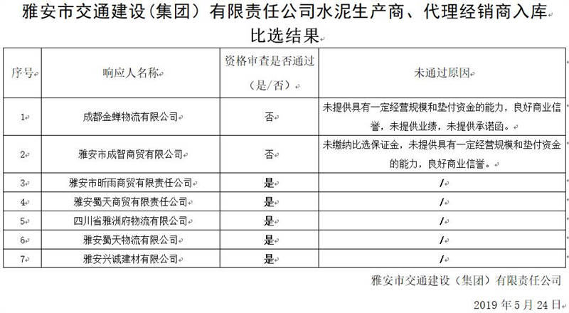 雅安市交通建设(集团)有限责任公司水泥生产商、代理经销商入库比选结果公示