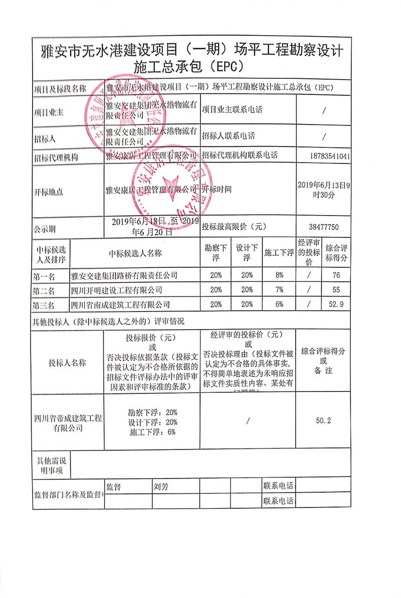 雅安市无水港建设项目(一期)场平工程勘察设计施工总承包(EPC)公开招标结果公示