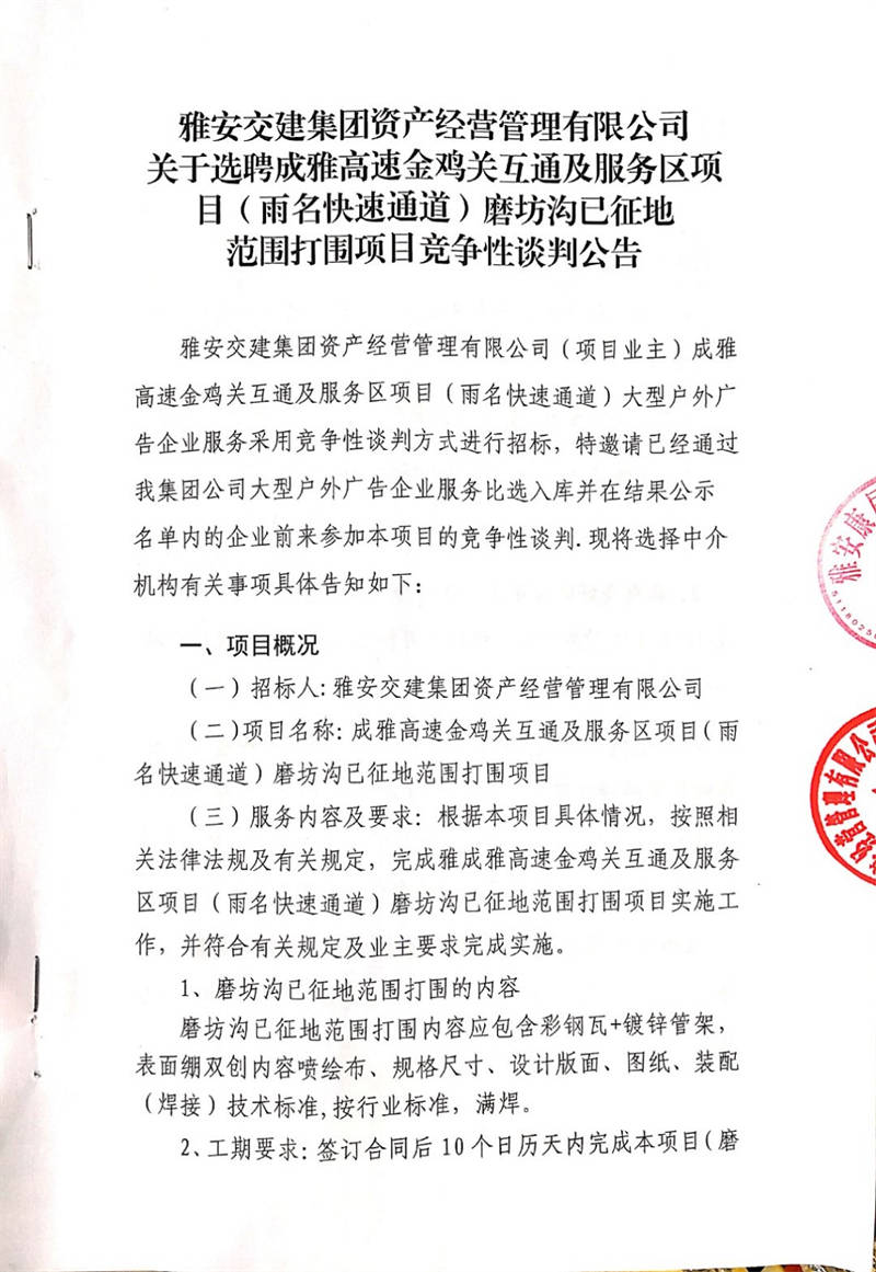米兰体育-米兰(中国)官网 资产经营管理有限公司关于选聘成雅高速金鸡关互通及服务区项目(雨名快速通道)磨坊沟已征地范围打围项目竞争性谈判公告
