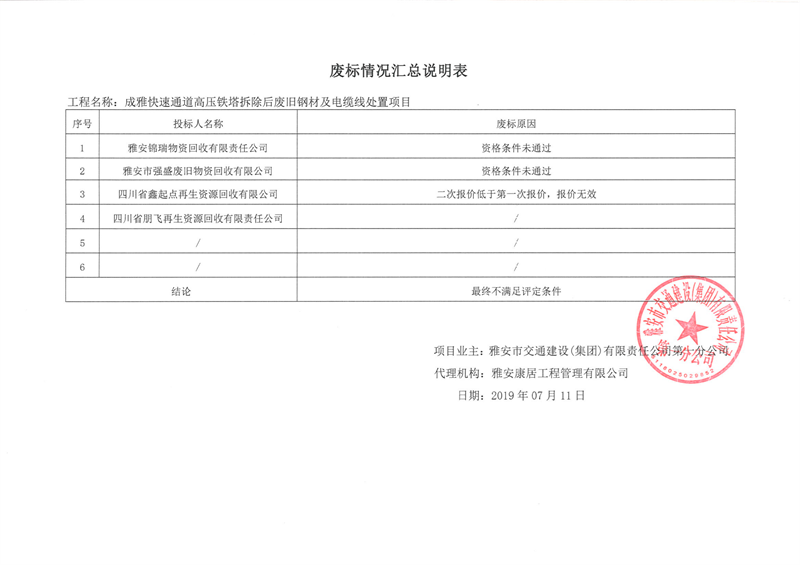 米兰体育-米兰(中国)官网 第一分公司成雅快速通道高压铁塔拆除后废旧钢材及电缆线处置项目废标情况汇总说明表