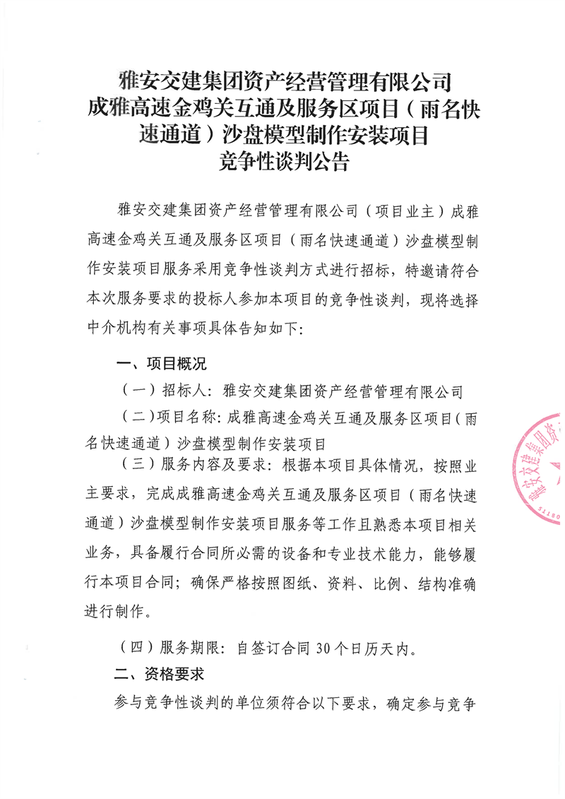 米兰体育-米兰(中国)官网 资产经营管理有限公司成雅高速金鸡关互通及服务区项目(雨名快速通道)沙盘模型制作安装项目竞争性谈判公告