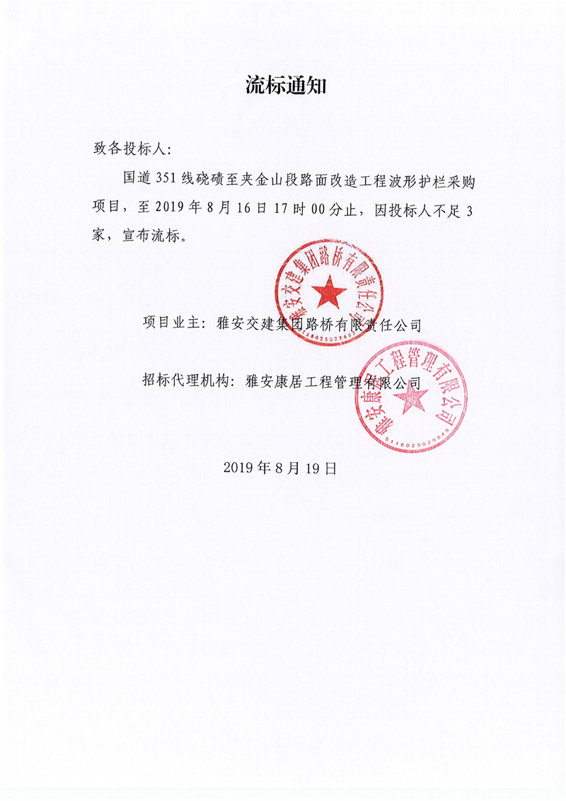 米兰体育-米兰(中国)官网 路桥有限责任公司国道351线硗碛至夹金山段路面改造工程波形护栏采购项目流标通知
