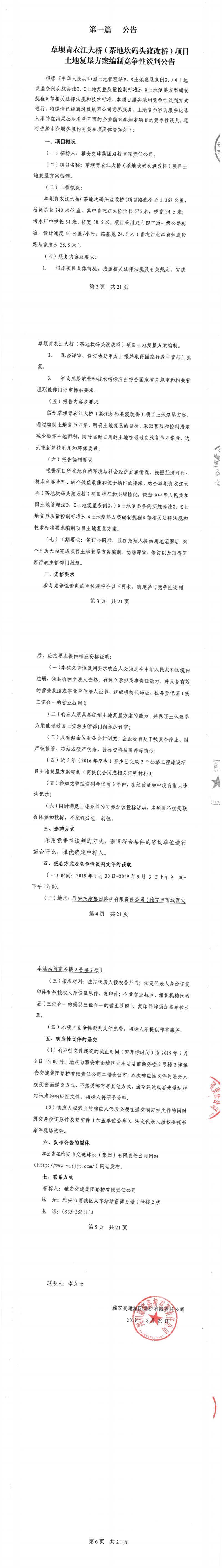 米兰体育-米兰(中国)官网 路桥有限责任公司草坝青衣江大桥(茶地坎码头渡改桥)土地复垦方案编制竞争性谈判公告