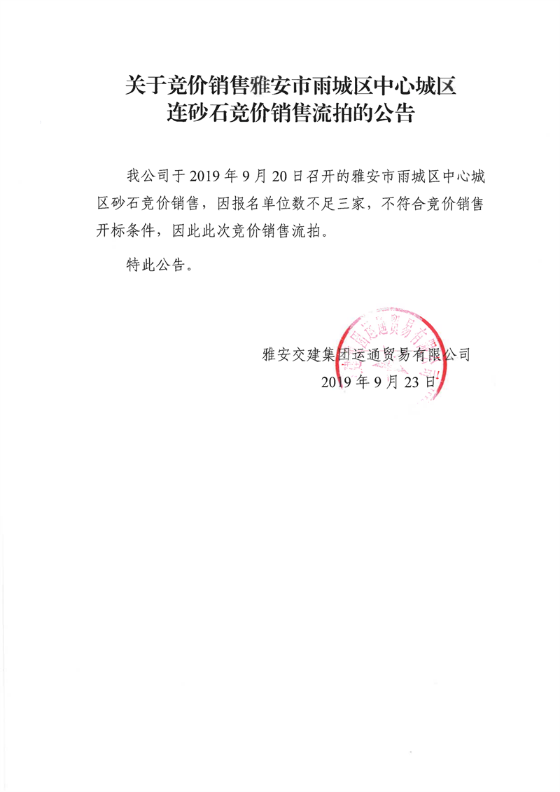 米兰体育-米兰(中国)官网 运通贸易有限公司关于竞价销售雅安市雨城区中心城区连砂石竞价销售流拍的公告