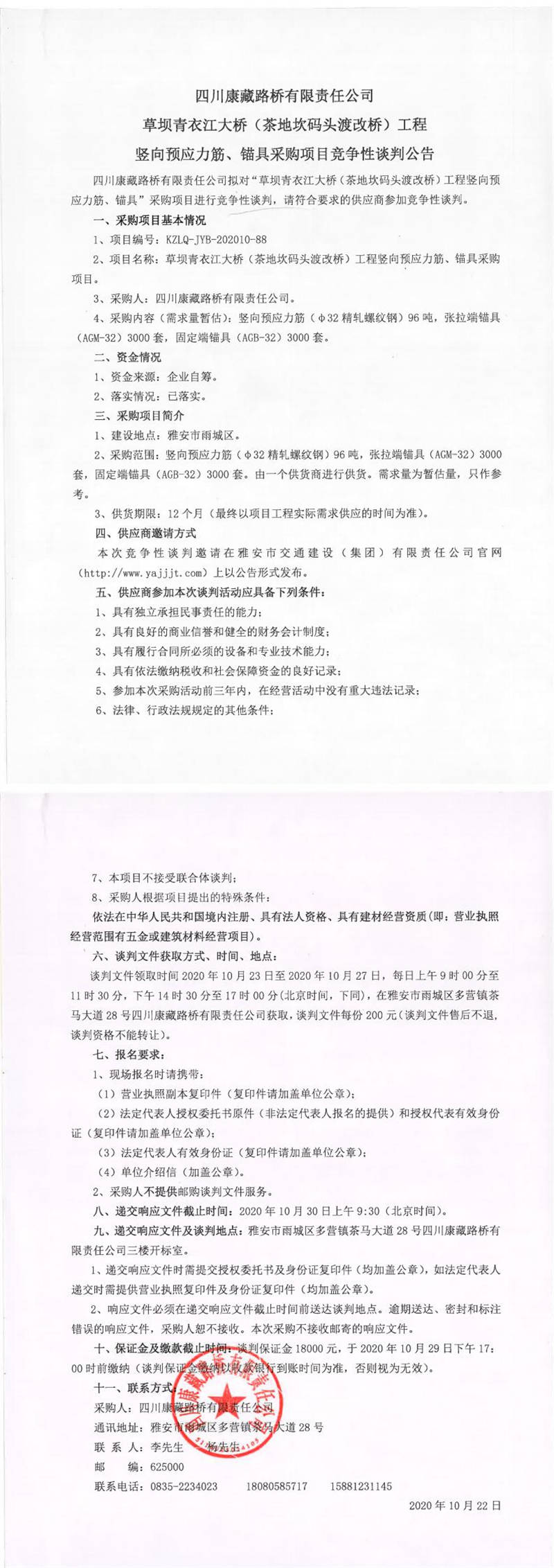 四川康藏路桥有限责任公司草坝青衣江大桥(茶地坎码头渡改桥)工程竖向预应力筋、锚具采购项目竞争性谈判公告