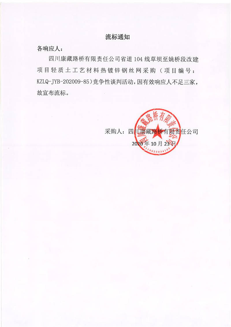 四川康藏路桥有限责任公司省道104线草坝至姚桥段改建项目轻质土工艺材料热镀锌钢丝网采购项目流标通知