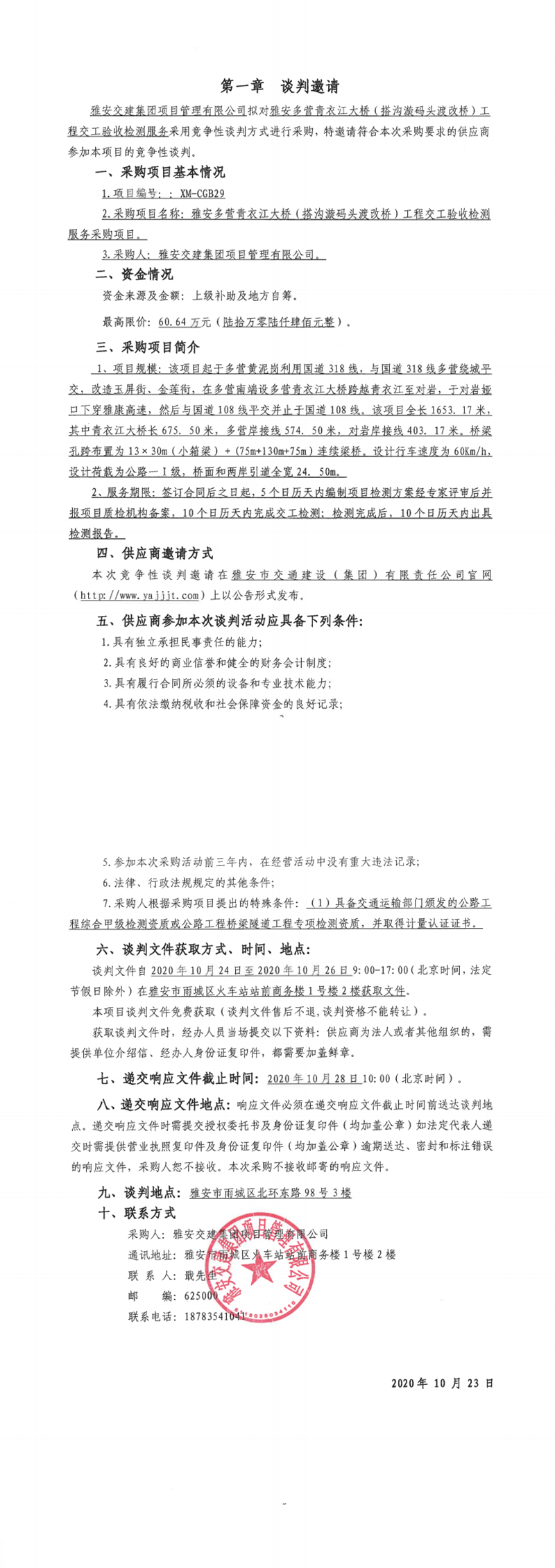 米兰体育-米兰(中国)官网 项目管理有限公司雅安多营青衣江大桥(搭沟漩码头渡改桥)工程交工验收检测服务采购项目竞争性谈判公告