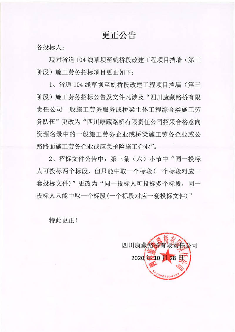 四川康藏路桥有限责任公司省道104线草坝至姚桥段改建工程项目挡墙(第三阶段)施工劳务招标项目更正公告