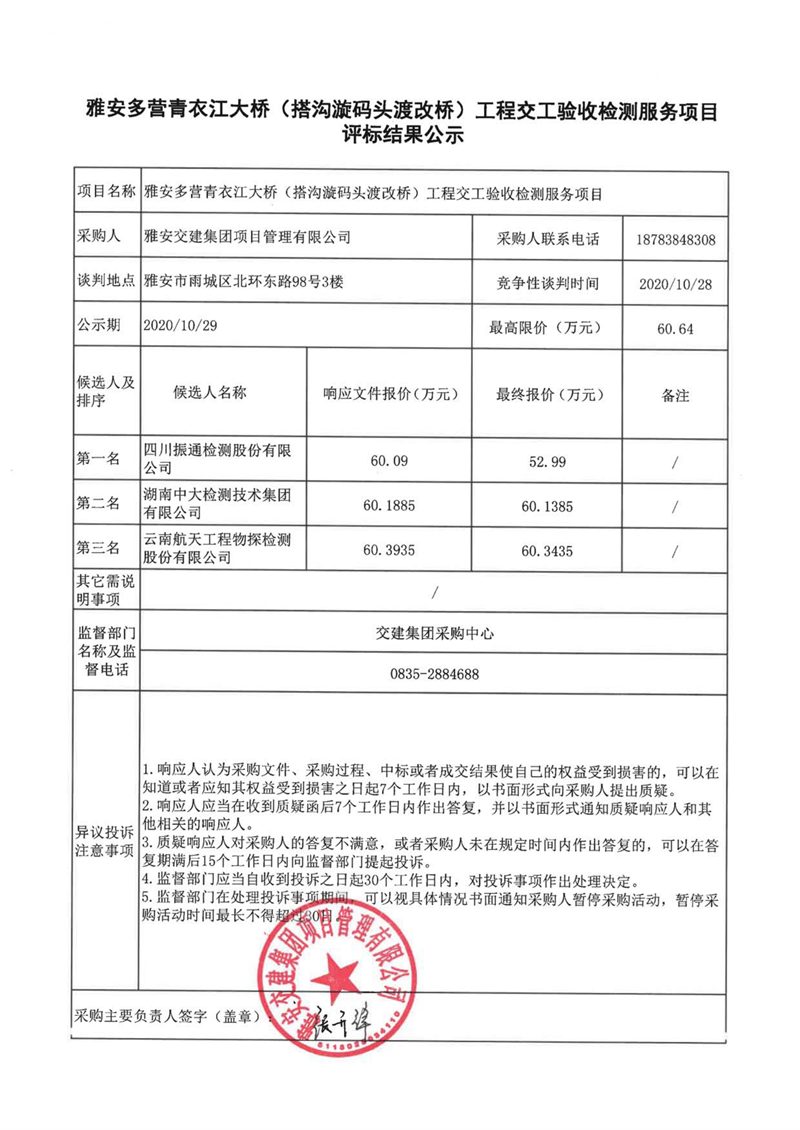 米兰体育-米兰(中国)官网 项目管理有限公司雅安多营青衣江大桥(搭沟漩码头渡改桥)工程交工验收检测服务项目评标结果公示