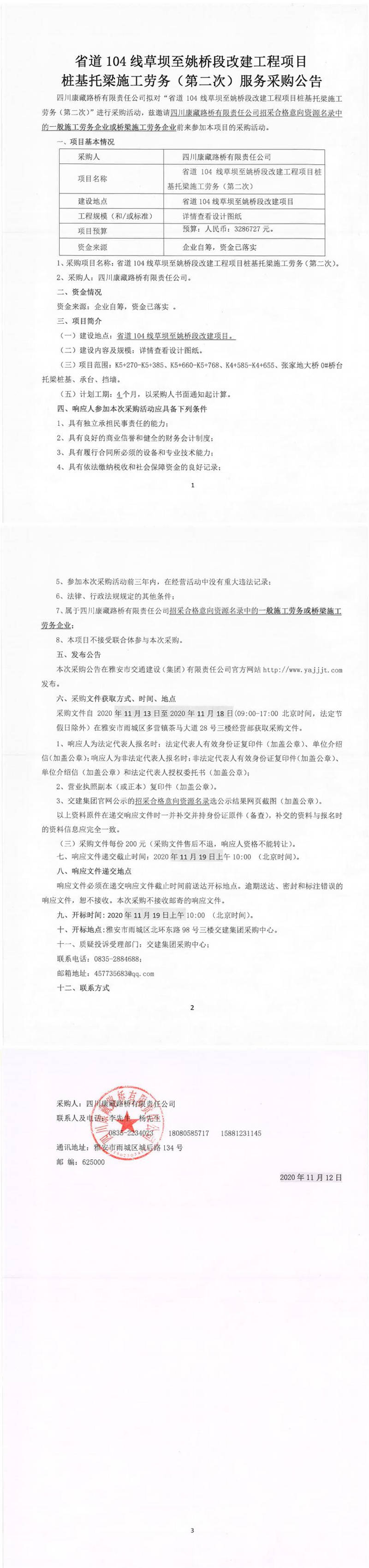 四川康藏路桥有限责任公司省道104线草坝至姚桥段改建工程项目桩基托梁施工劳务(第二次)服务采购公告