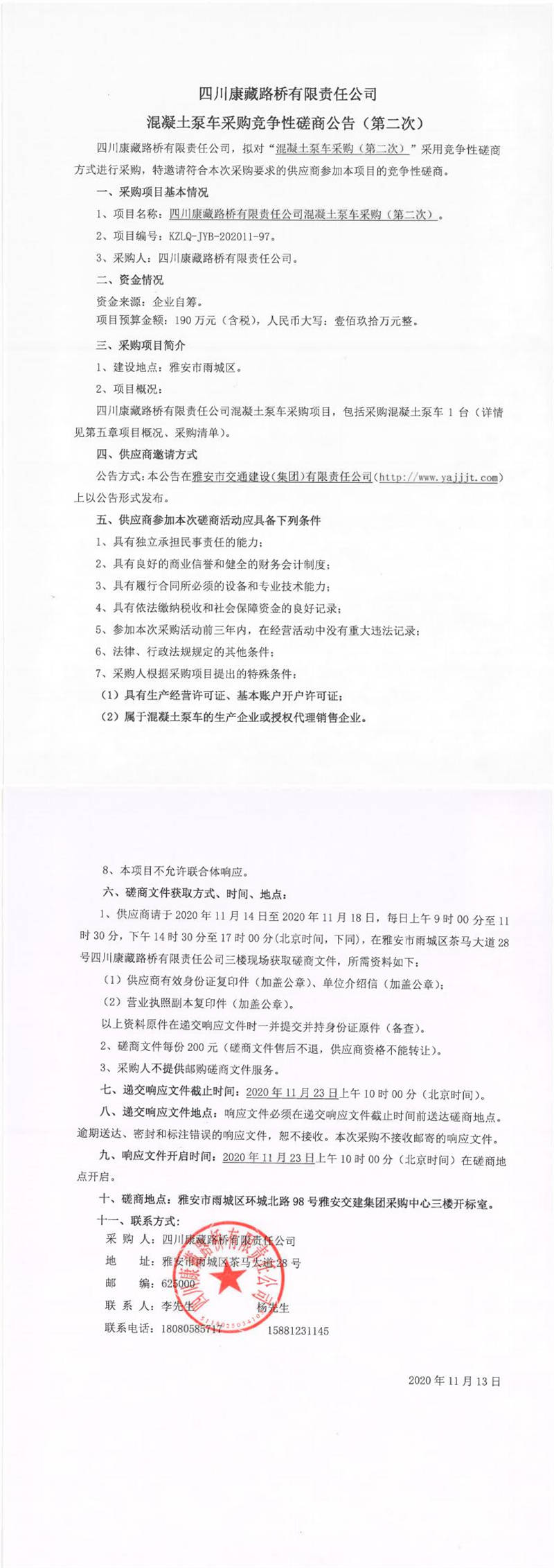 四川康藏路桥有限责任公司混凝土泵车采购竞争性磋商公告(第二次)