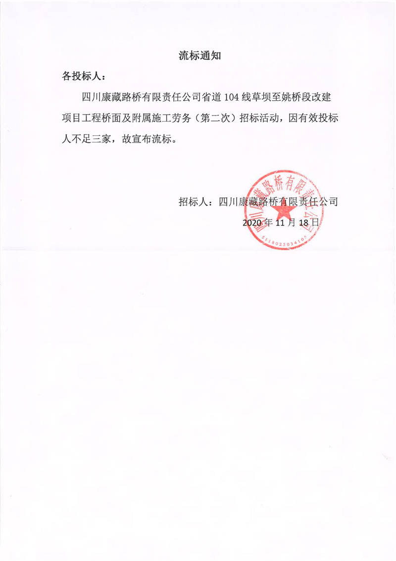 四川康藏路桥有限责任公司省道104线草坝至姚桥段改建项目工程桥面及附属施工劳务(第二次)流标通知