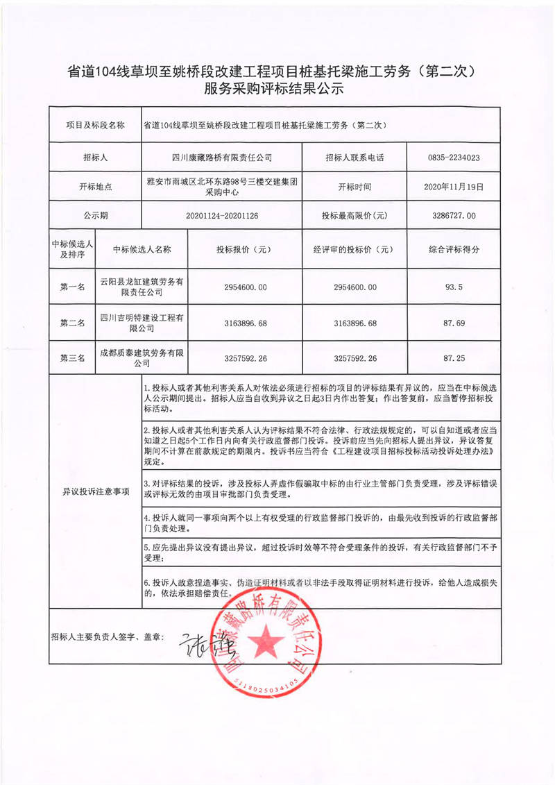 四川康藏路桥有限责任公司省道104线草坝至姚桥段改建工程项目桩基托梁施工劳务(第二次)服务采购评标结果公示
