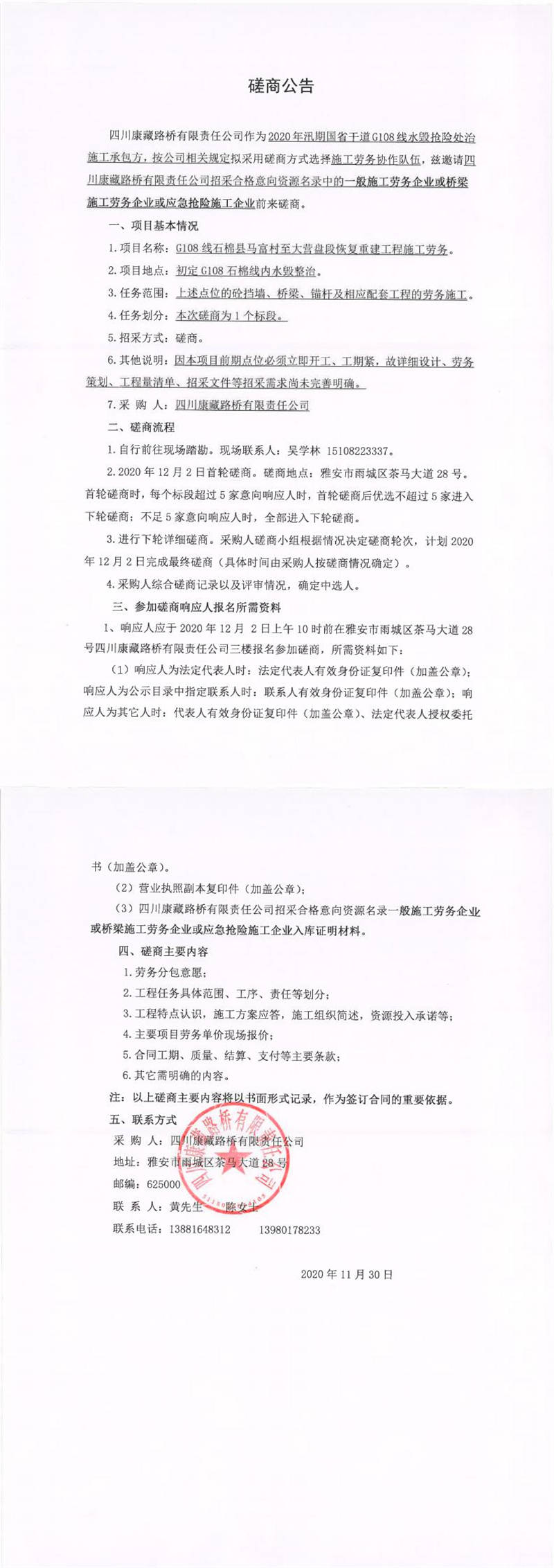 四川康藏路桥有限责任公司G108线石棉县马富村至大营盘段恢复重建工程施工劳务磋商公告