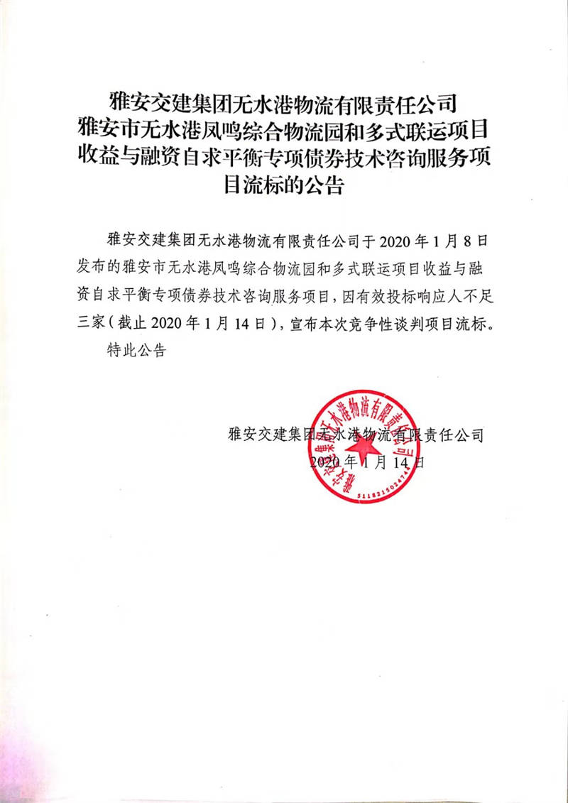 米兰体育-米兰(中国)官网 无水港物流有限责任公司雅安市无水港凤鸣综合物流园和多式联运项目收益与融资自求平衡专项债券技术咨询服务项目流标的公告