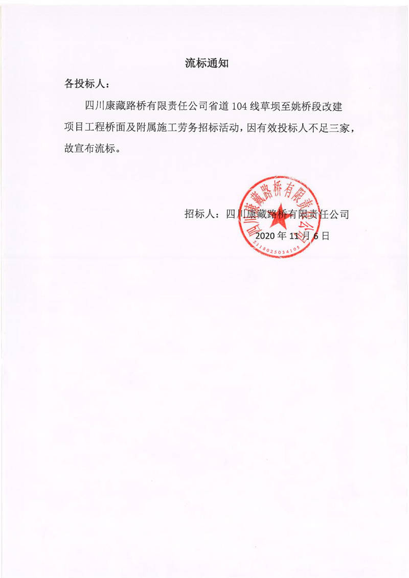 四川康藏路桥有限责任公司省道104线草坝至姚桥段改建项目工程桥面及附属施工劳务流标通知