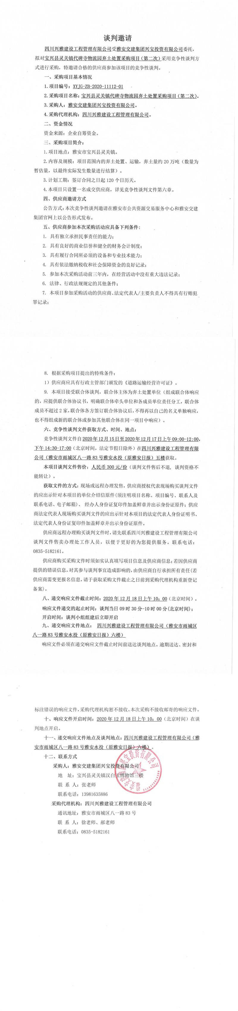 米兰体育-米兰(中国)官网 兴宝投资有限公司宝兴县灵关镇代碑寺物流园弃土处置采购项目(第二次)谈判公告