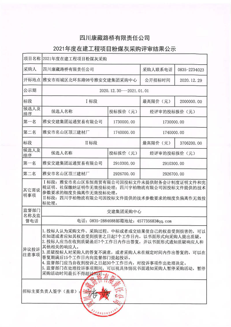 四川康藏路桥有限责任公司2021年度在建工程项目粉煤灰采购评审结果公示