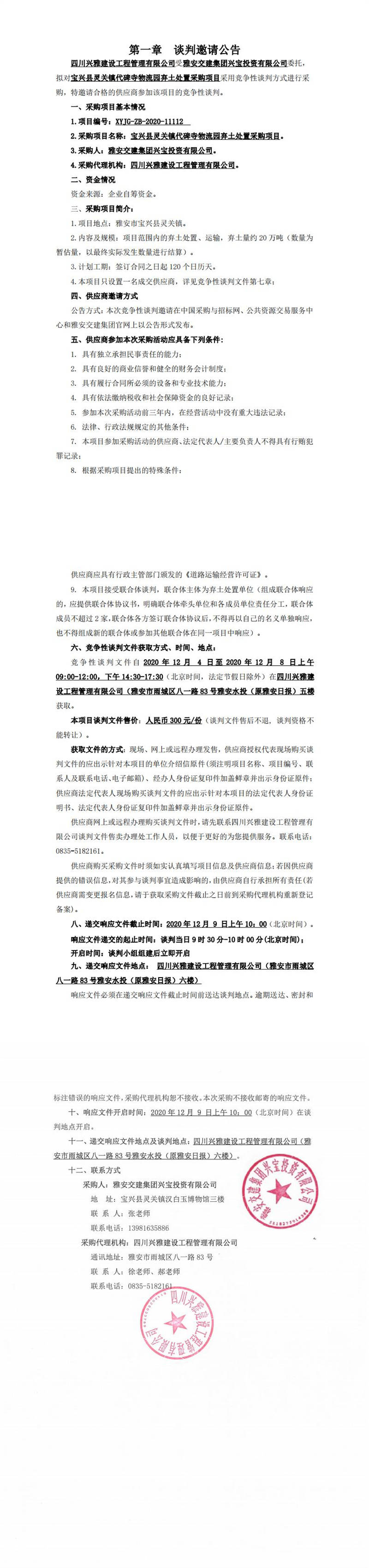 米兰体育-米兰(中国)官网 兴宝投资有限公司宝兴县灵关镇代碑寺物流园弃土处置采购项目谈判公告