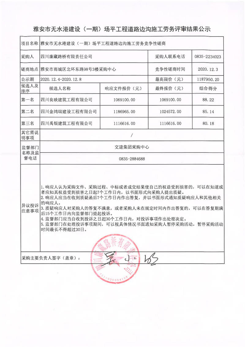 四川康藏路桥有限责任公司雅安市无水港建设(一期)场平工程道路边沟施工劳务评审结果公示