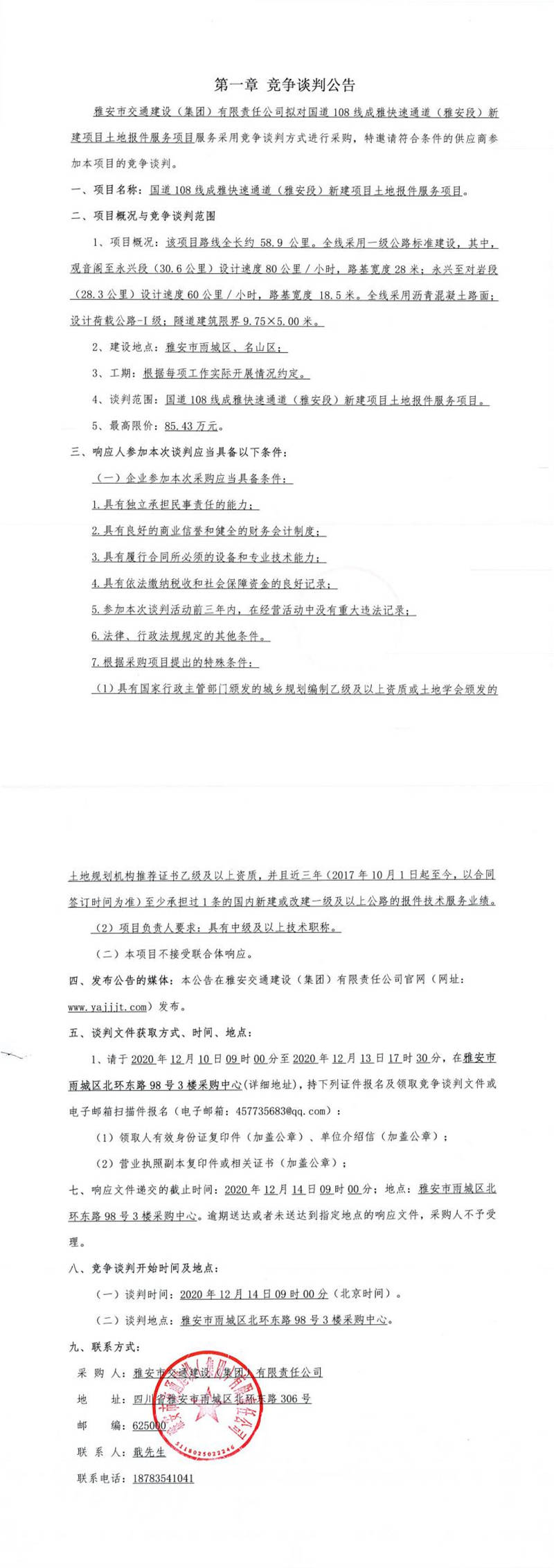 米兰体育-米兰(中国)官网 国道108线成雅快速通道(雅安段)新建项目土地报件服务项目竞争谈判公告