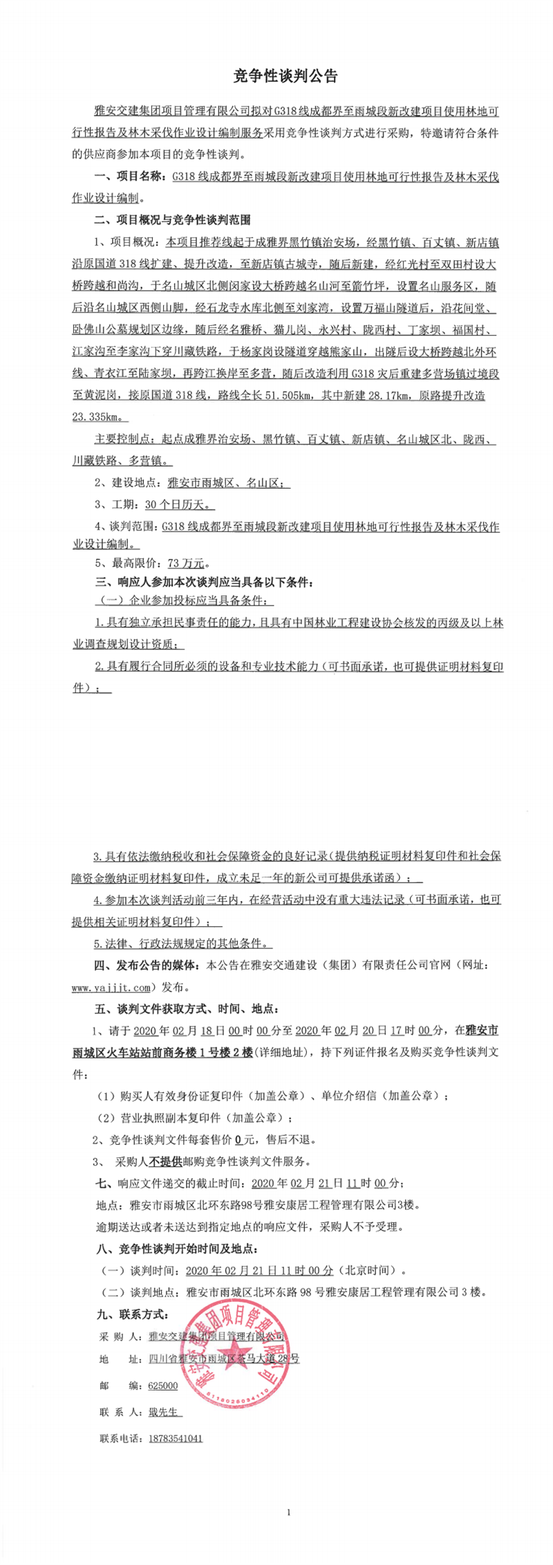 米兰体育-米兰(中国)官网 项目管理有限公司G318线成都界至雨城段新改建项目使用林地可行性报告及林木采伐作业设计编制竞争性谈判公告