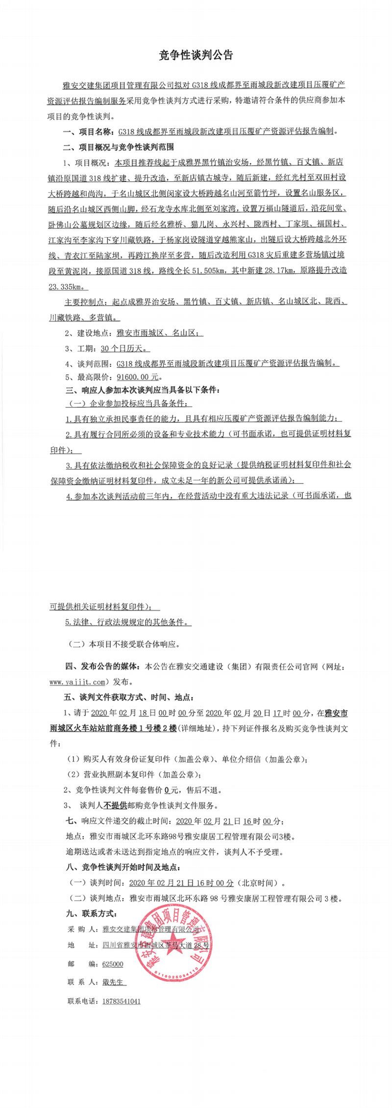 米兰体育-米兰(中国)官网 项目管理有限公司G318线成都界至雨城段新改建项目压覆矿产资源评估报告编制竞争性谈判公告