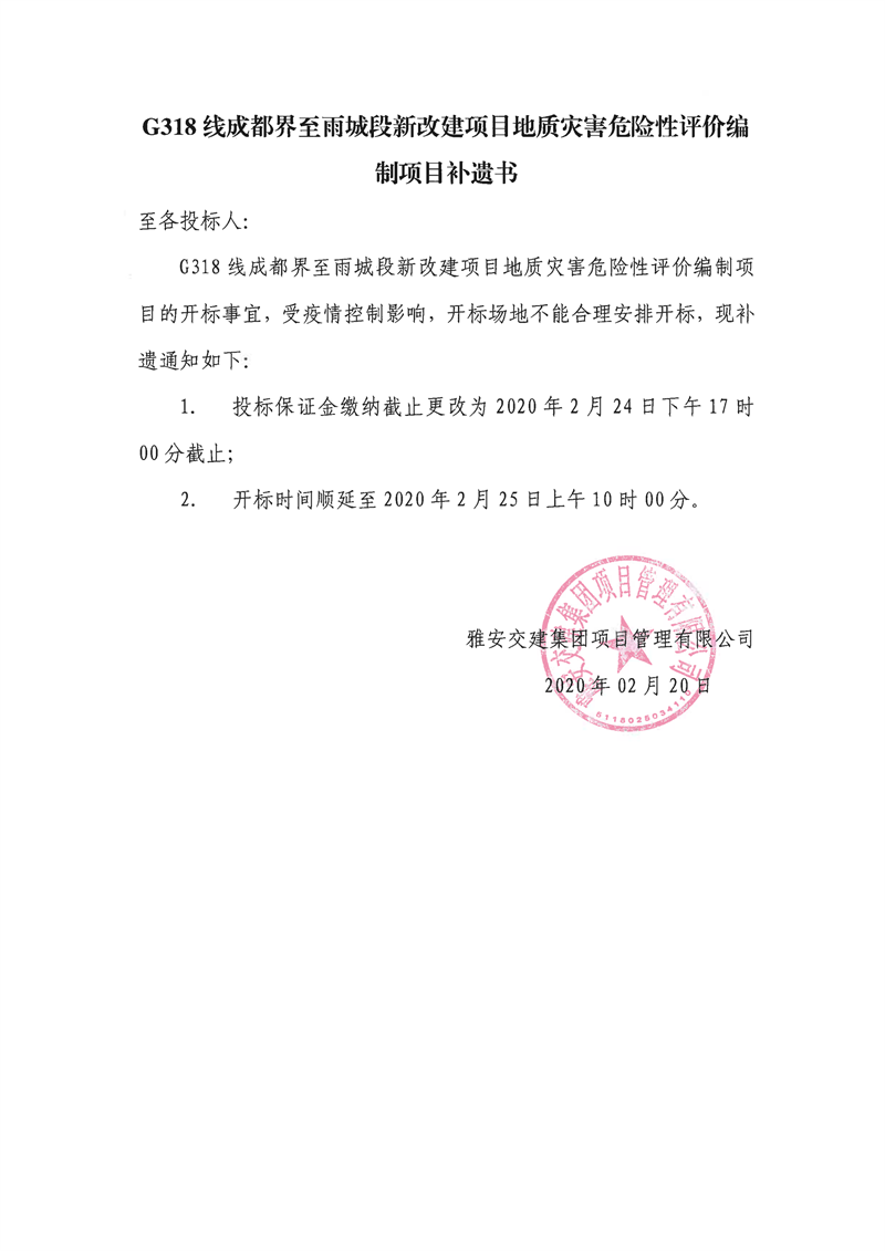 米兰体育-米兰(中国)官网 项目管理有限公司G318线成都界至雨城段新改建项目地质灾害危险性评价编制项目补遗书