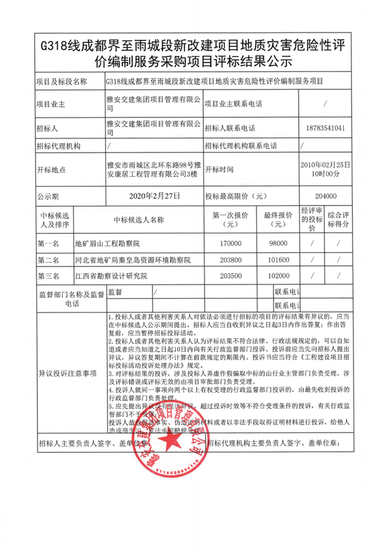 米兰体育-米兰(中国)官网 项目管理有限公司G318线成都界至雨城段新改建项目地质灾害危险性评价编制服务项目评标结果公示
