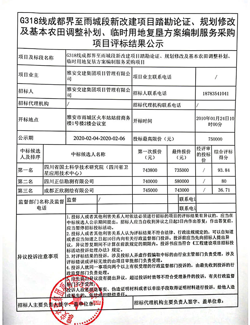米兰体育-米兰(中国)官网 项目管理有限公司G318线成都界至雨城段新改建项目踏勘论证、规划修改及基本农田调整补划、临时用地复垦方案编制服务采购项目评标结果公示